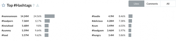 2. Focus on the right food-focused hashtags: To start your food-focused influencer search, check some of the most popular food hashtags on Instagram. A closer look at Captiv8’s insights platform shows that hashtags like #nomnomnom (14 million likes), #foodporn (7.36 million) and #instafood (5.68 million) are great places to start looking for food-focused creators and get a sense for popular food content.