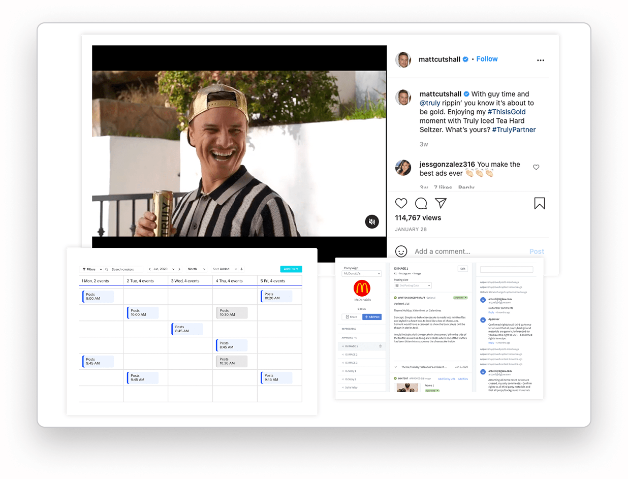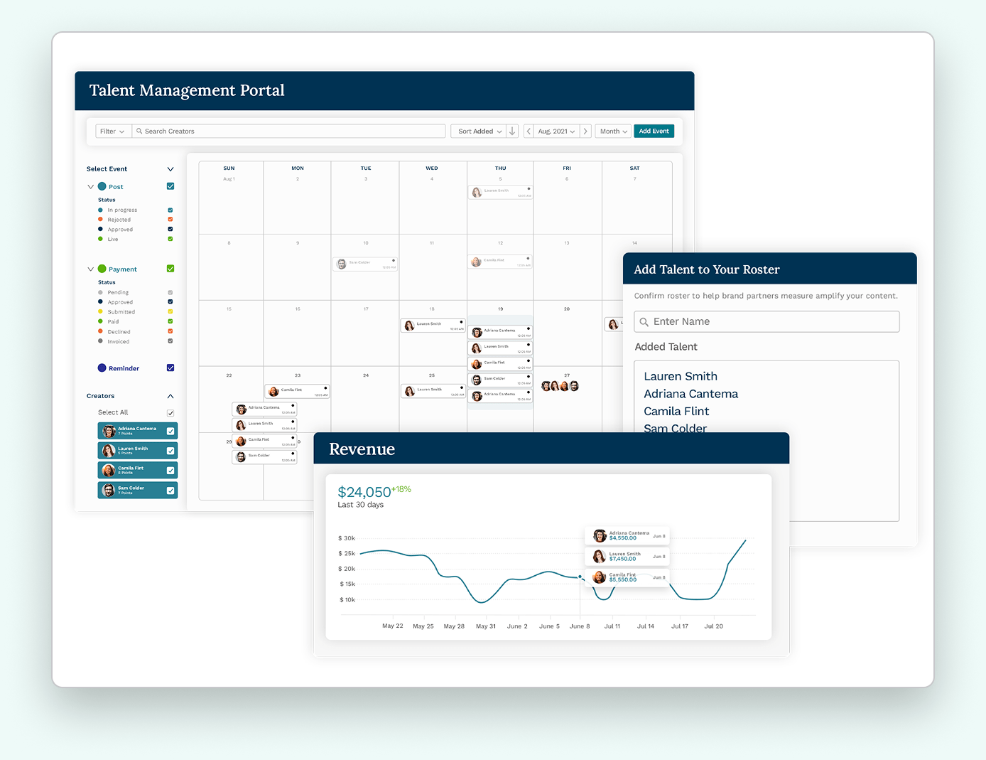 Agents and managers, this is for you. Use one portal to manage your entire roster. From authentication and profile management to brand inquiries, payment statuses and post scheduling, we give you the tools you need to manage all of your creators from our hub - without your clients ever having to log in.