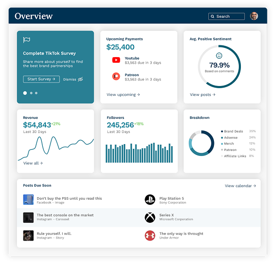 You are masterful at building relationships with your community and brand partners. Now lean on us so you have more time to do what you do best - create. Simplify collaborations, track payments, analyze performance, and better understand your audience – all right here.